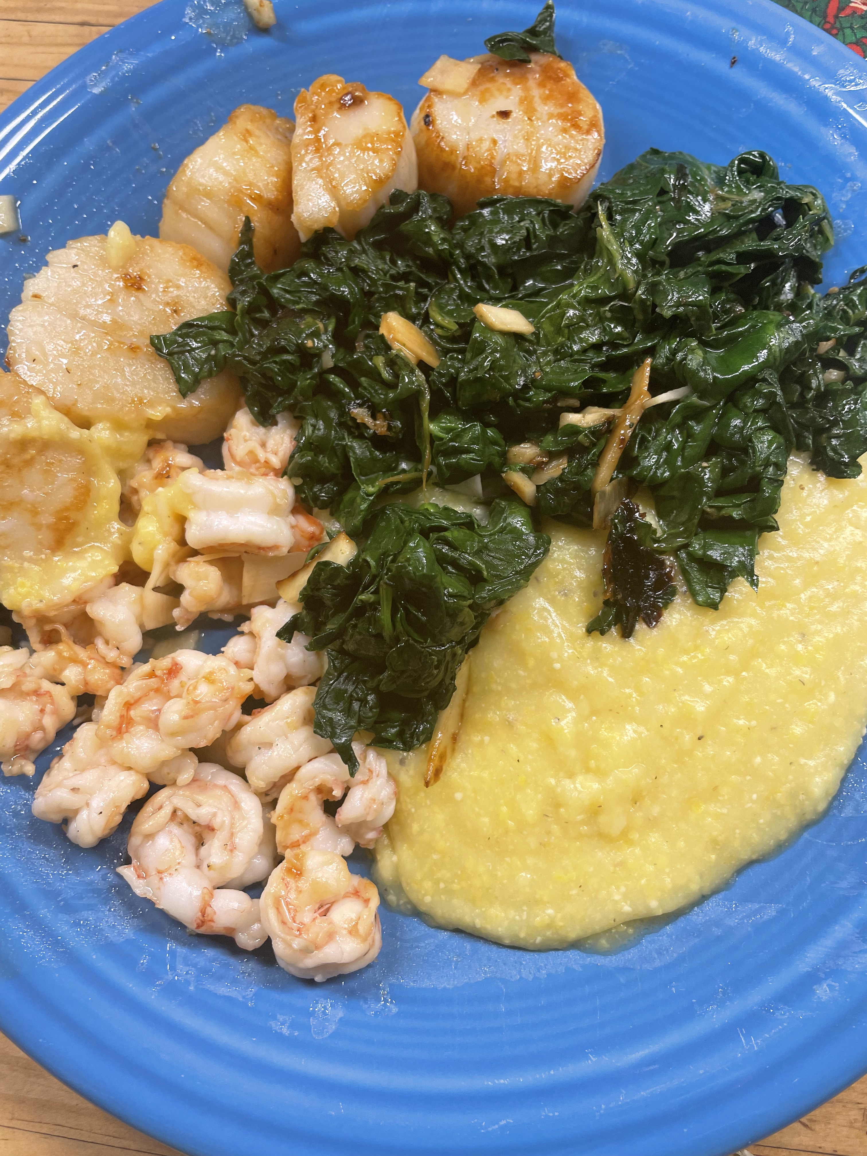 One of my stated principles is to use shit up—find those things tucked away in the freezer and eat them—but it often fights with another deep-seated habit, that of “saving” Good Things rather than using or consuming them. With food, that means I might end up saving something past its prime. (More on this in another post.) So, Sunday I attacked both of those things by making scallops, side-striped shrimp, and polenta; the polenta used up the last of my cornmeal and the scallops have been around awhile. I wilted some spinach and threw it in a pan with a little butter and garlic, too.