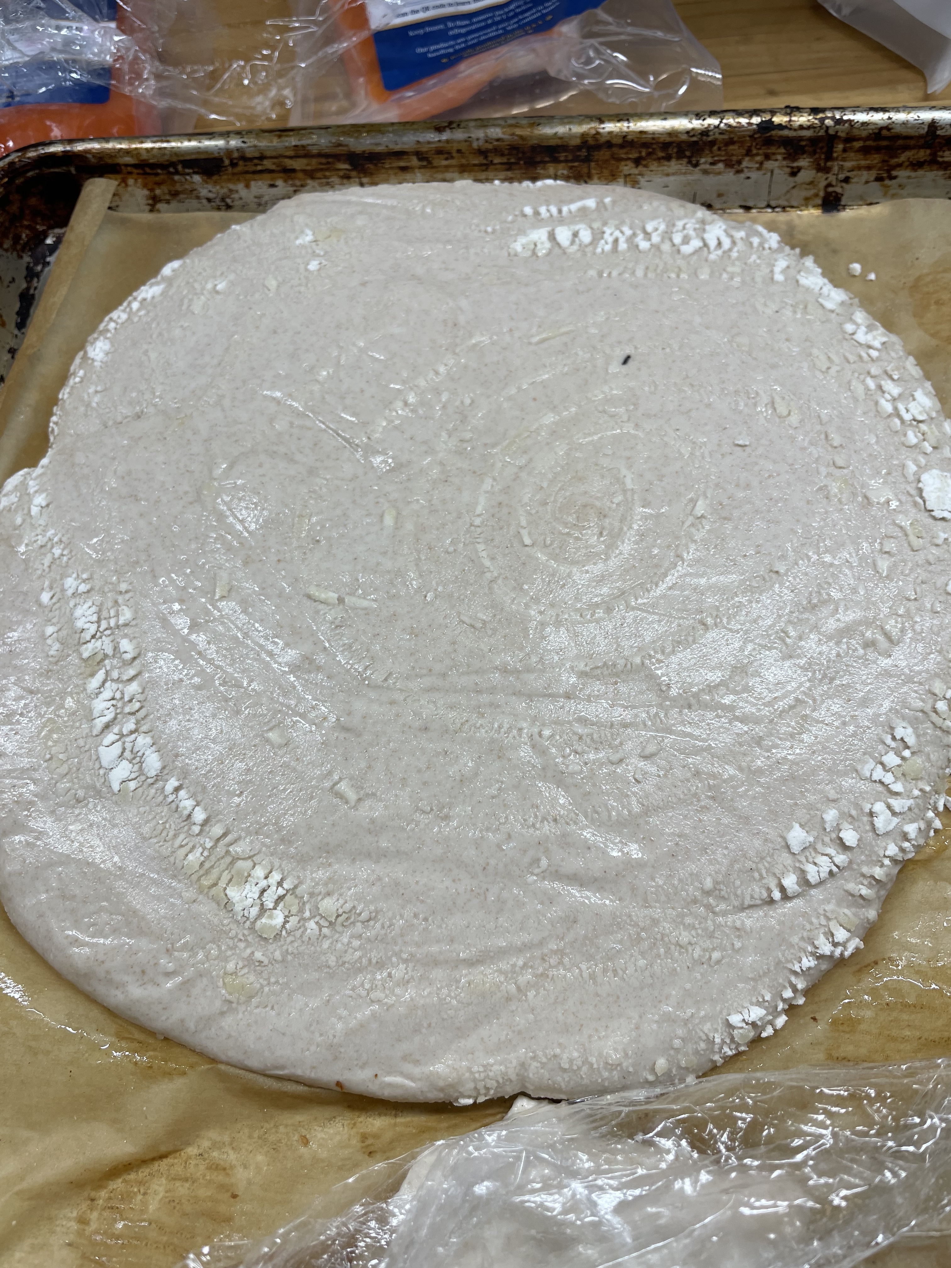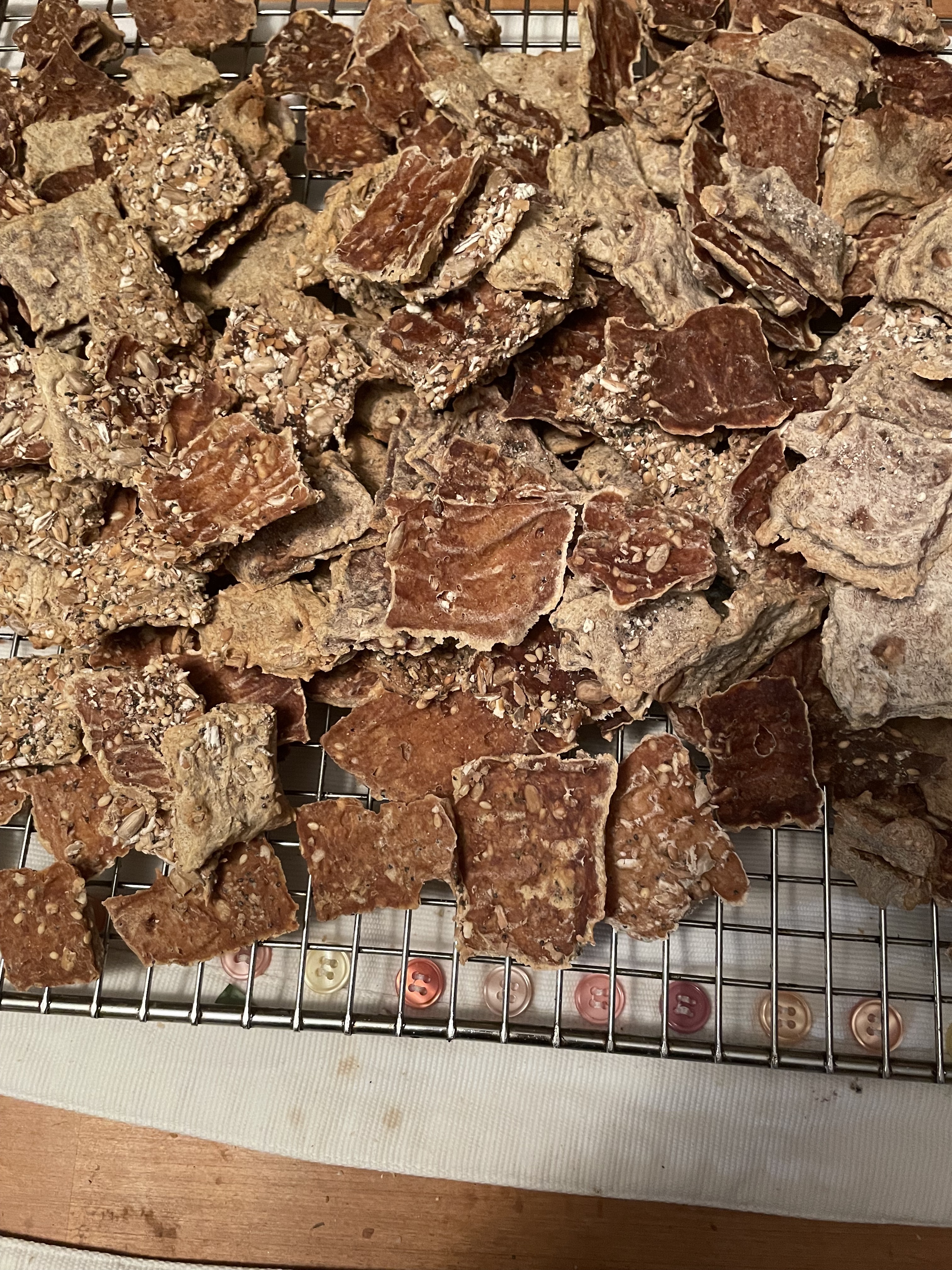 I put the two sheet pans of failure dough in the fridge, covered with greased plastic wrap, and figured I’d come back to it on Friday, though I had no idea what I was going to do with the massive quantities. I really did not want to throw it out; way too much flour was involved, and it seemed like such a waste. Finally it came to me: crackersI’ve seen recipes that basically just use sourdough discard for crackers (though I haven’t tried that), and I’ve made my own crackers using Peter Reinhardt’s formula from his whole-grain baking book. I also had a bunch of King Arthur’s Harvest Grains Blend, because it’s a good shorthand add-in when I want to add something to a basic loaf or to waffles or pancakes.